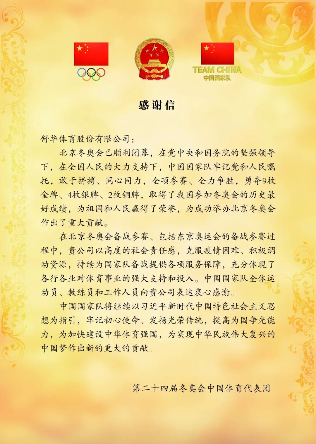 2022 第二十四届冬奥会中国体育代表团感谢信 第二十四届冬奥会中国体育代表团 感谢信 查看